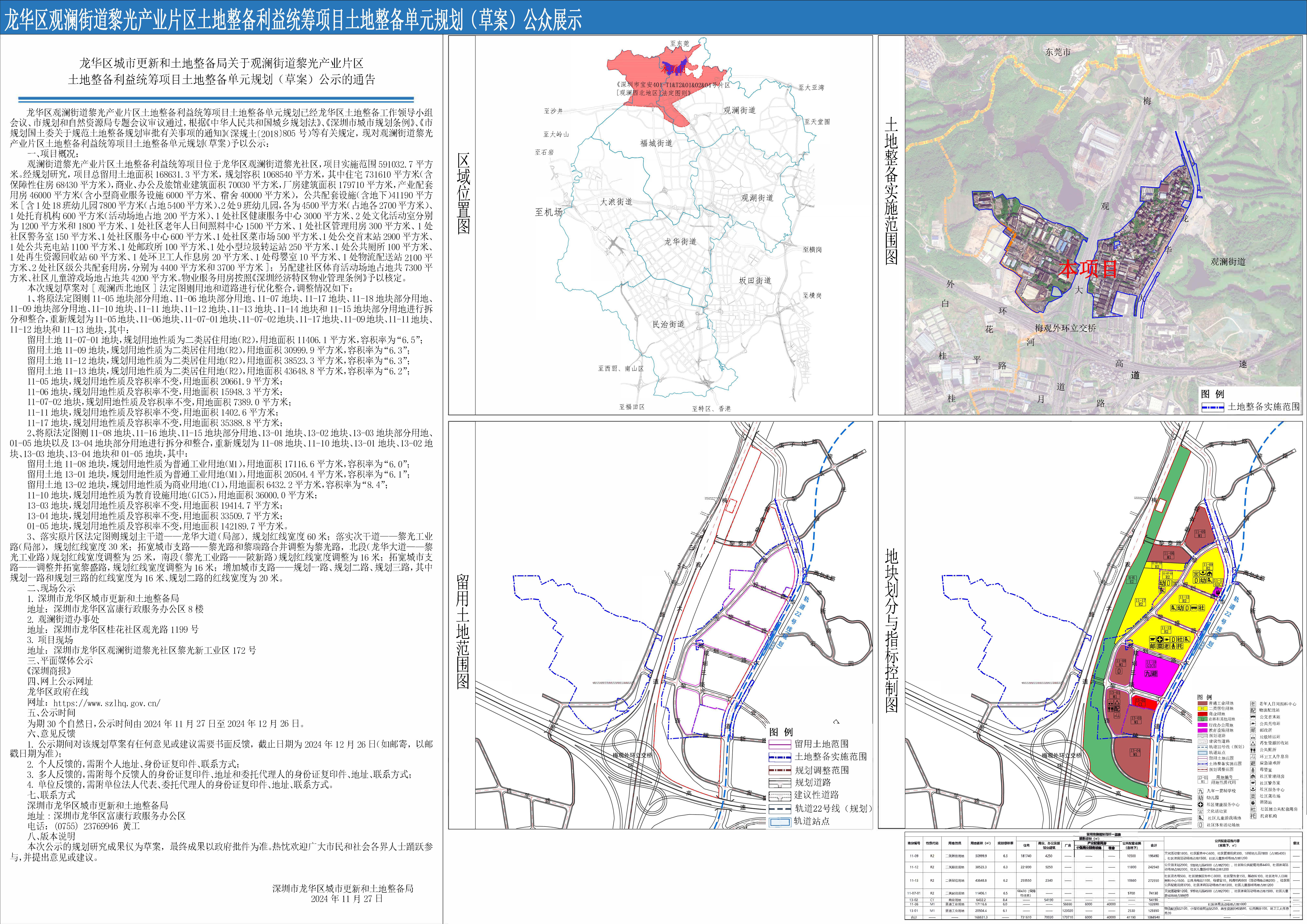 觀瀾街道黎光產(chǎn)業(yè)片區(qū)土地整備利益統(tǒng)籌項目位于龍華區(qū)觀瀾街道黎光社區(qū),項目實施范圍591032.7平方米。經(jīng)規(guī)劃研究,項目總留用土地面積168631.3平方米,規(guī)劃容積1068540平方米,其中住宅731610平方米(含保障性住房68430平方米),商業(yè)、辦公及旅館業(yè)建筑面積70030平方米,廠房建筑面積179710平方米,產(chǎn)業(yè)配套用房46000平方米(含小型商業(yè)服務(wù)設(shè)施6000平方米、宿舍40000平方米),公共配套設(shè)施(含地下)41190平方米[含1處18班幼兒園7800平方米(占地5400平方米)、2處9班幼兒園,各為4500平方米(占地各2700平方米)、1處托育機構(gòu)600平方米(活動場地占地200平方米)、1處社區(qū)健康服務(wù)中心3000平方米、2處文化活動室分別為1200平方米和1800平方米、1處社區(qū)老年人日間照料中心1500平方米、1處社區(qū)管理用房300平方米、1處社區(qū)警務(wù)室150平方米、1處社區(qū)服務(wù)中心600平方米、1處社區(qū)菜市場500平方米、1處公交首末站2900平方米、1處公共充電站1100平方米、1處郵政所100平方米、1處小型垃圾轉(zhuǎn)運站250平方米、1處公共廁所100平方米、1處再生資源回收站60平方米、1處環(huán)衛(wèi)工人作息房20平方米、1處母嬰室10平方米、1處物流配送站2100平方米、2處社區(qū)級公共配套用房,分別為4400平方米和3700平方米];另配建社區(qū)體育活動場地占地共7300平方米、社區(qū)兒童游戲場地占地共4200平方米。物業(yè)服務(wù)用房按照《深圳經(jīng)濟特區(qū)物業(yè)管理條例》予以核定。本次規(guī)劃草案對[觀瀾西北地區(qū)]法定圖則用地和道路進行優(yōu)化整合,調(diào)整情況如下: