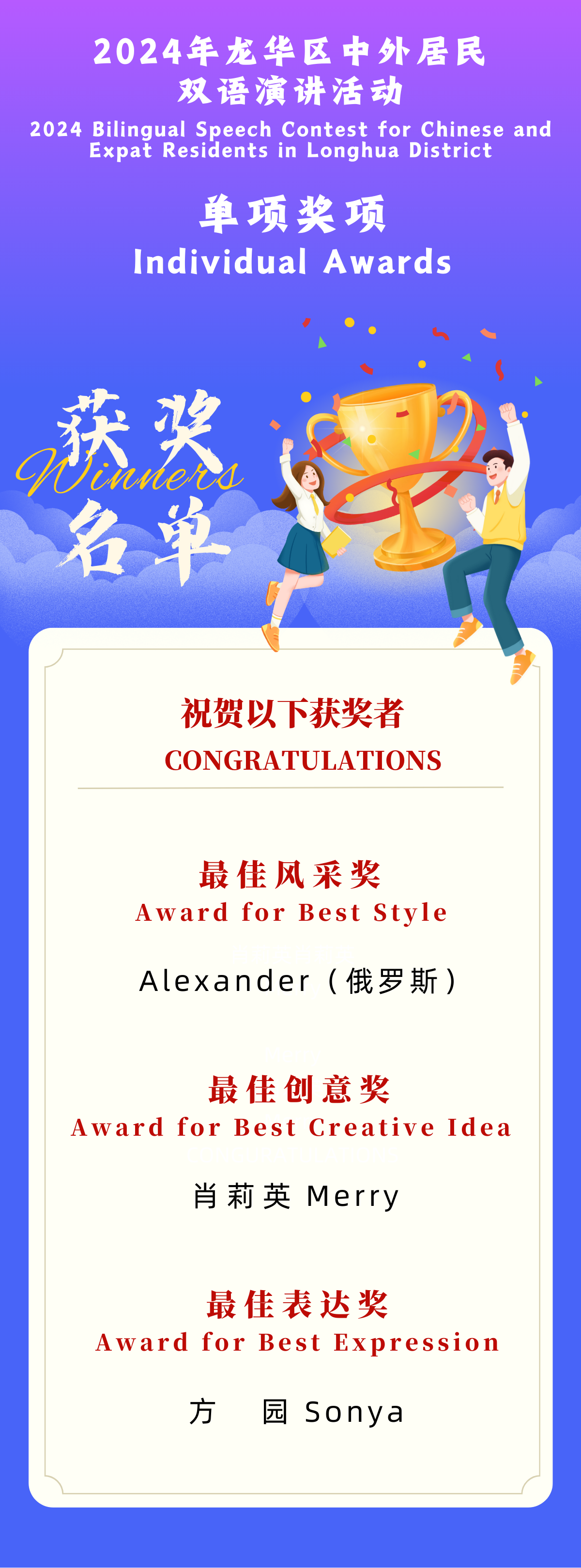 On November 16, the 2024 Bilingual Speech Contest for Chinese and Expat Residents in Longhua District came to a successful conclusion! The final gathers 20 participants from home and abroad with the theme of "Opportunities" to discuss about the endless possibilities that Shenzhen offers. Let's take a look at their impressive performances!