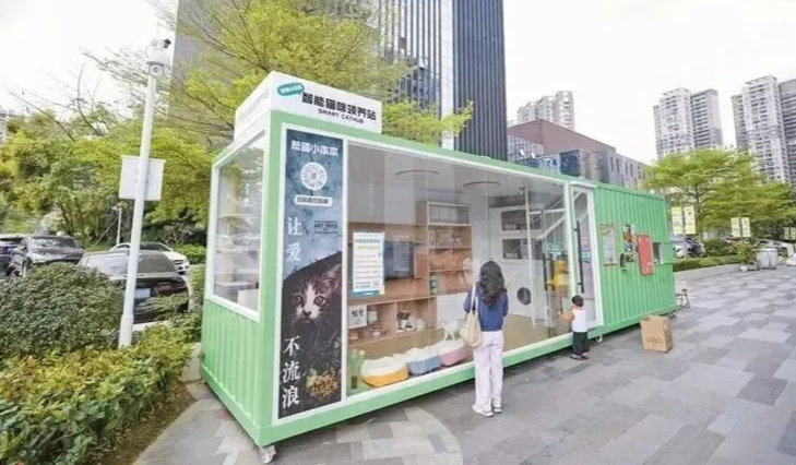 Longhua District’s first smart rescue-and-adoption station for stray cats debuts in the lively Langyuan Garden business district.