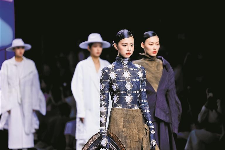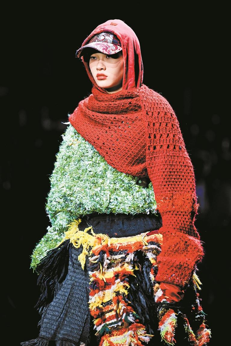 這些創作者的設計邏輯成熟完整,敏銳聚焦于玉蘭、柳編、麥穗、皮影、窗格等中華優秀傳統文化中“小而美”的具象元素,積極探索材質邊界,從天然礦石、泥塑土坯等非傳統領域汲取靈感,注重工藝研究與穿著體驗,成功將跨界材料融入設計,實現創意與商業的無縫銜接。設計師們積極踐行“零浪費”可持續理念,通過重塑廢棄布料、二次創作編織袋、回收閑置衣物及快遞紙箱等方式,研發新型面料,最大化實現廢料活化與資源再利用,展現年輕一代對可持續時尚的擔當。