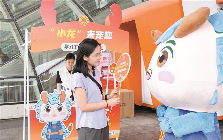 線下活動中,“小龍”走進職工群眾集中場所,開展“知識問答+趣味游戲”的沉浸式宣傳。首站走進龍華區數字創新中心工會大食堂,圍繞“工會歷史”“職工權益”設計知識題卡,“小龍”與職工面對面互動。“在吃飯時學知識,還能領小禮物,太實用了!”參與職工紛紛表示。第二站現身龍華設計產業園游園會,“小龍”帶領職工邊玩邊學。“以前覺得工運知識枯燥,但‘小龍’一出現,氛圍就輕松了!”一位職工說。