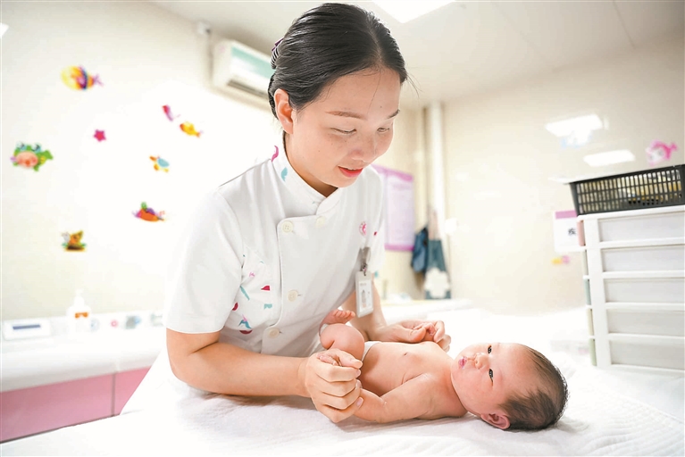 在龍華區婦幼保健院,產一科護士李昭君正溫柔地為新生兒撫觸。