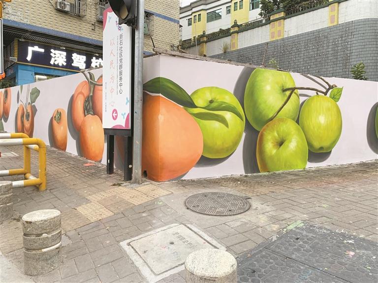 大浪實驗學(xué)校師生們創(chuàng)作的《生活吉意 果蔬之美》主題墻繪,位于大浪社區(qū)新嶺路與永樂路交會處。