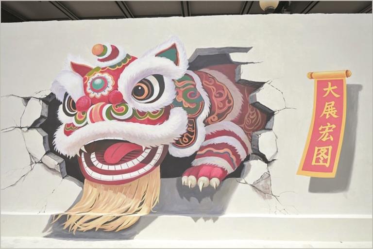 龍華區(qū)行知學(xué)校師生們創(chuàng)作的《韻動南粵 活力醒獅》主題墻繪,位于福城街道大水坑社區(qū)桔坑路冠志廠。