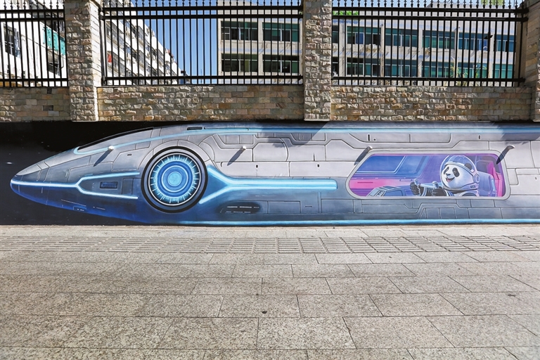 龍華街道盛波工業園的圍墻仿佛推開了一扇通往明日世界的門扉。這幅長達84米、高1.8米的巨幅墻繪,邀請每一位路人走入一個由科幻元素、城市符號與互動設計共同構筑的未來都市。