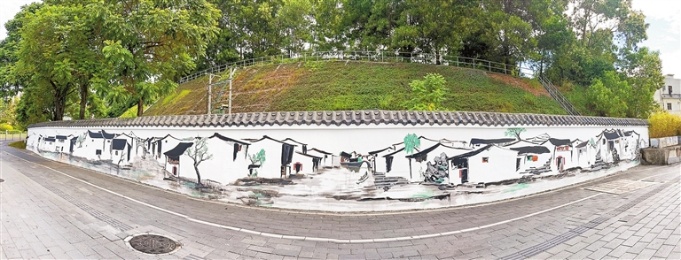 福城街道龍瀾大道與觀天路交會處,一幅40米長的水墨長卷靜靜鋪展,以東方美學撫慰都市心靈,讓快節奏的城市保有一隅詩意棲居。