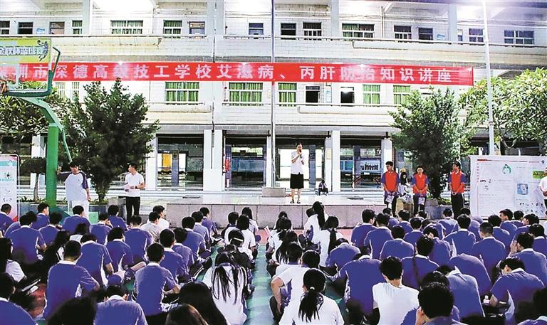 在深德技工學(xué)校,龍華疾控醫(yī)生用真實(shí)案例和圖示,講解防艾知識(shí)。