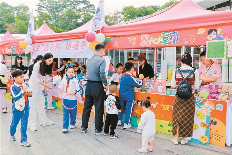 此外,賽場外同步開啟的“愛心童市”人氣爆棚,“愛心童市”以少先隊員為主體,通過以物換物、愛心義賣的形式,在豐富少先隊課余生活的同時,培養其社會責任意識和愛心奉獻精神。來自龍華區玉龍學校、龍飛小學、深圳外國語學校(集團)龍華學校的200多位少先隊員化作“小攤主”精心布置著攤位,閑置繪本、手工玩偶、創意手作整齊陳列,吸引了眾多市民“淘寶”。市集同步設置了“空杯減塑”展覽區以及可回收物展示區,造型新穎的“空杯減塑”美陳裝置前,通過層層遞進的實物呈現,空杯從分類投放到化身再生工藝品的過程清晰可見。可回收物展示區里,工作人員現場演示智能回收箱體操作,解答市民疑問。深圳市垃圾分類推廣大使芬芬玩偶與龍華區垃圾分類IP形象龍小芬玩偶也來到了現場,萌趣的形象吸引了孩子們的目光,成為傳遞綠色理念的鮮活載體。據統計,此次市集累計換享物品200余件、公益義賣400余次。