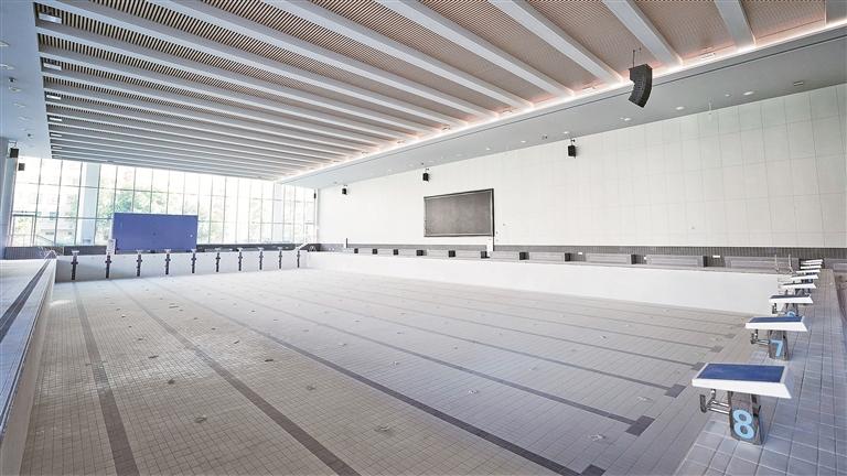 首層堪稱“運動活力核心區”,這里設有2171個座位的多功能館,可靈活承辦各類中小型體育賽事與文藝活動;還有1個室內標準游泳館、1個室外訓練池與1個兒童泳池構成完善的水上運動矩陣,滿足不同年齡段市民的游泳需求;1個包含21片球場的室內羽毛球館則成為此項運動愛好者的熱門選擇。值得一提的是,這里還有一座約1000平方米的真冰場,可為周邊居民帶來獨特的運動體驗。在主場館的另一邊,還有專門為滑板愛好者打造的滑行區域。