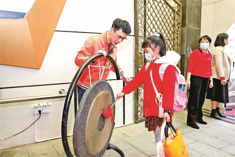觀瀾中心學(xué)校學(xué)生進(jìn)校園后敲鑼為自己鼓勁。