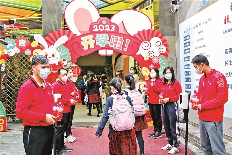 2月6日上午,觀瀾中心學(xué)校的老師身著紅裝在校門(mén)口迎接學(xué)生。
