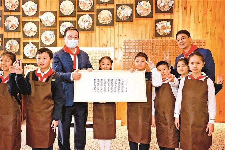 ▲華南實驗學校學生代表向區委書記王衛贈送活字印刷作品。