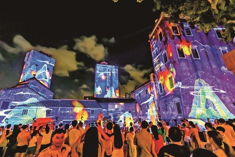 以觀瀾古墟夜游為主線,打造古韻今風(fēng)的都市活力河段。觀瀾古墟燈光秀以觀瀾古墟夜游為主線,綜合運(yùn)用投影、視頻、激光、霧森、圖案、音響等組成的7D全息影像技術(shù),將六大業(yè)態(tài)“夜食、夜宿、夜秀、夜游、夜購、夜娛”與“文創(chuàng)、藝術(shù)、藝展、數(shù)字體驗(yàn)”結(jié)合,形成“一核、二街、六巷、八景”的空間結(jié)構(gòu)和場(chǎng)景單元。目前,觀瀾古墟燈光秀正在上演,古建筑群墻壁出現(xiàn)蛟龍出海、白鶴翩飛等沉浸式逼真視覺效果,流光溢彩,如夢(mèng)如幻,彰顯濱水古墟的文化魅力。