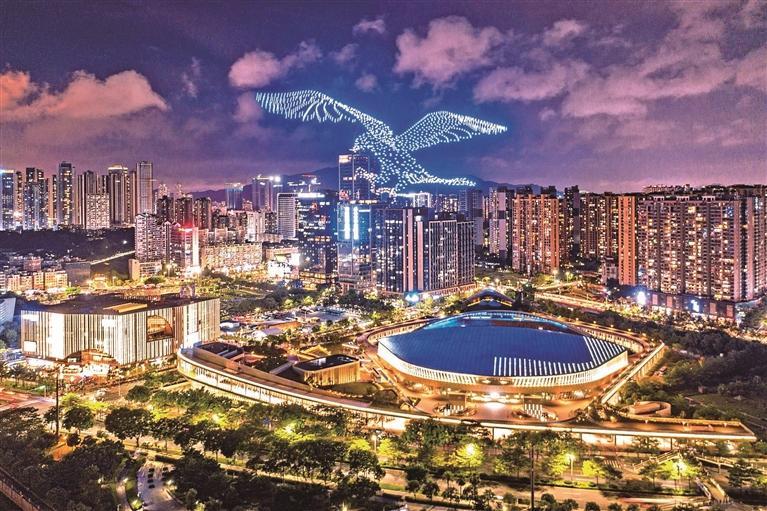 ▲無人機編隊飛行表演點亮龍華夜空,展示低空經濟魅力。
