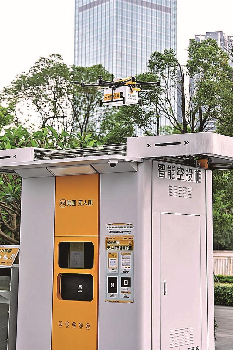 ▲美團無人機將外賣投送至無人機航線智能空投柜。