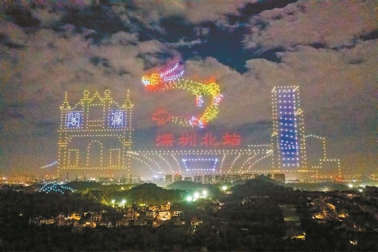 無人機表演分為“地理區(qū)位、龍華地標、數(shù)字藝術(shù)、我愛龍華”四個篇章共10幕畫面。整場演出由一卷竹簡浮現(xiàn)“閱見龍華 詩畫星空”八字拉開序幕。朗誦聲響起,山水生態(tài)畫卷緩緩鋪開,陽臺山、觀瀾河、白鷺等元素立體呈現(xiàn),“三山半落青天外,一水中分白鷺洲”高懸于空。緊接著,詩句“古韻古墟,大浪淘沙成就巨變;觀湖觀瀾,福城民治龍舞華章”映入眼簾,抬首望去,一條栩栩如生的中國龍橫空而出,環(huán)繞觀瀾古墟、深圳北站等地標向前游動,歷經(jīng)古今變化,抵達現(xiàn)代化的中軸層城。