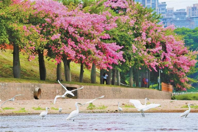 觀瀾河上白鷺與紅花相映成趣。