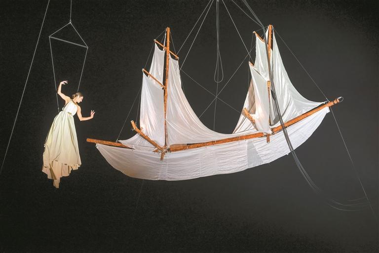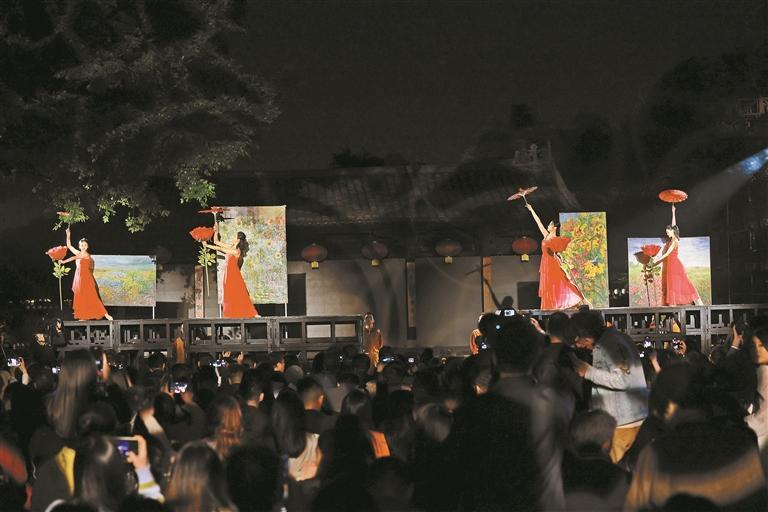 開幕式當晚,夜色中的觀瀾版畫村如夢如幻——意大利著名演出團隊Festi group傾情打造光影藝術大秀《藝術與自然》,將人們沉浸式地帶入了光影藝境。整場演出共分9個章節,芭蕾舞者身著華服,以觀瀾古建筑為多媒體空間,以星夜為幕,凌空飛舞,在聲光電打造的影像中表達著對大自然、對美的敬意。