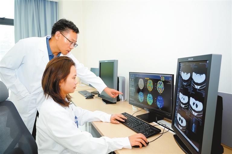 市第二人民醫院龍華醫院影像醫學科醫生使用AI醫學影像智能處理系統觀看報告。