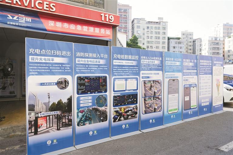 上圍新村消防站旁擺放著電動自行車治理宣傳展板,向市民宣傳相關規范。