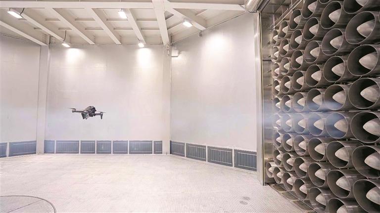 這個引導風洞分為內外艙兩部分,外艙直徑18米、內艙直徑10米,可支持翼展4米的航空器在垂直起降、巡航、懸停等姿態(tài)下的氣動特性、飛控性能以及安全性能等研究。該風洞采用“風機矩陣”設計,由3組不同方向的風機矩陣和底部的1組繞流風機組成,風速最高可達60米每秒,響應時間縮短至2秒內,不僅能控溫控濕,還能實現(xiàn)雨、雪、冰雹等城市低空環(huán)境全要素模擬,為飛行安全提供測試保障。自投用以來,引導風洞已為多家低空企業(yè)提供小微型飛行器研發(fā)測試服務。