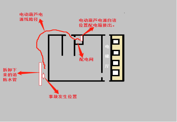7日上午,蔡始豐與劉冬平到場(chǎng)施工,蔡始豐使用一卷四芯電纜線兩兩鉸接當(dāng)成兩芯電纜線接入錦鯉大廈三樓配電箱下端的一個(gè)2P單相開關(guān)出線端,另一端連接一個(gè)86型8孔插座給微型電動(dòng)葫蘆供電。事發(fā)時(shí)蔡始豐站在門式腳手架上使用控制手柄操作微型電動(dòng)葫蘆將發(fā)生漏水的消防水管吊運(yùn)下來,劉冬平在地面接應(yīng),9時(shí)10分許,劉冬平突然發(fā)出叫聲,蔡始豐立即跳下腳手架用手去拉劉冬平,此時(shí)蔡始豐感到被電擊到,意識(shí)到劉冬平觸電了。