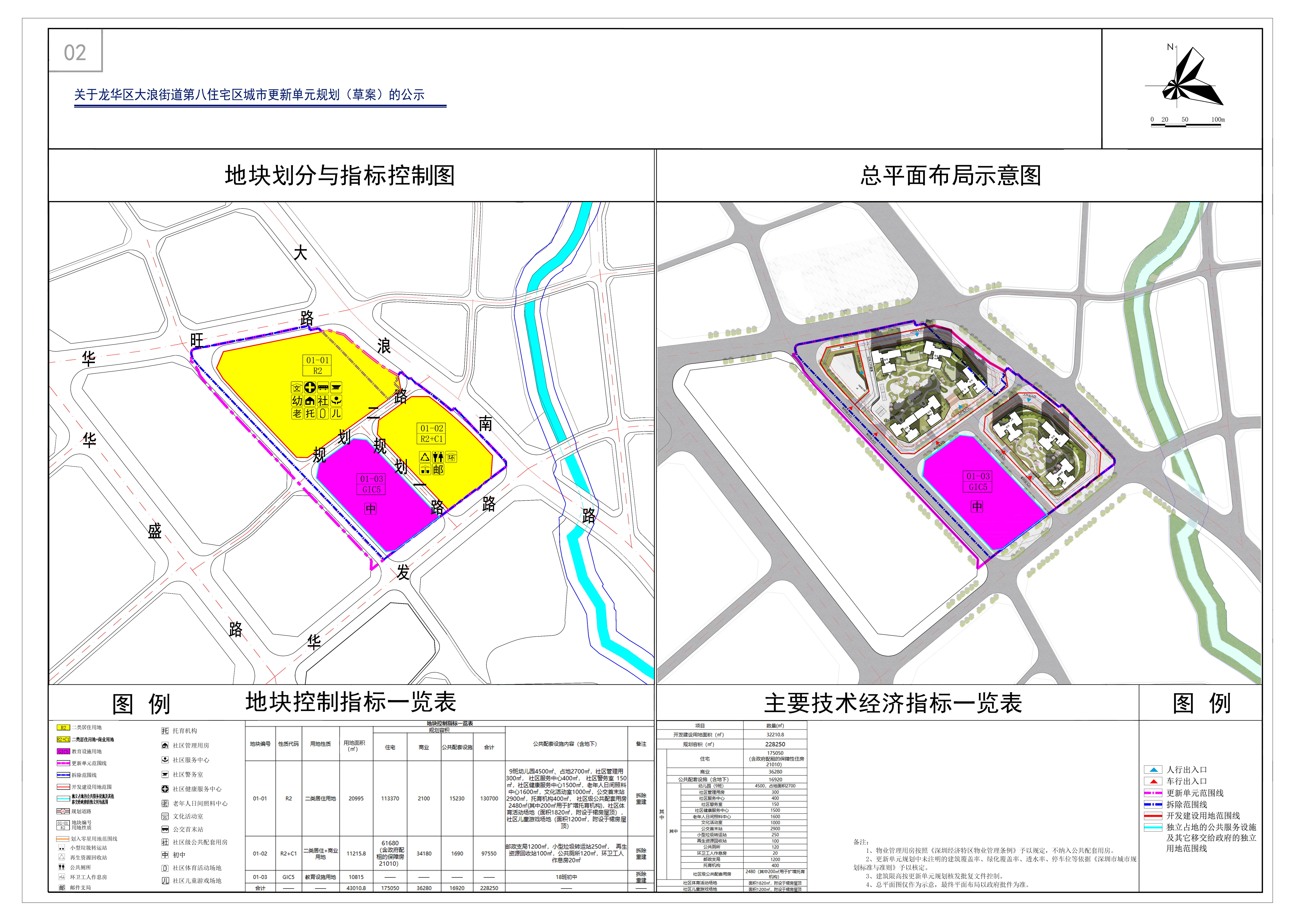 項目位于龍華區大浪街道大浪南路與華旺路交匯處西南側。更新單元用地面積57618.5平方米,拆除用地面積51946.5平方米,其中開發建設用地面積32210.8平方米(其中2181.1平方米國有未出讓的零星用地按照城市更新辦法及其實施細則一并出讓給該項目實施主體)。規劃容積228250平方米,其中住宅175050平方米(含政府配租的保障性住房21010平方米),商業、辦公及旅館業建筑36280平方米,公共配套設施(含地下)16920平方米[其中9班幼兒園4500平方米、占地2700平方米,社區管理用房300平方米,社區服務中心400平方米,社區警務室150平方米,社區健康服務中心1500平方米,社區老年人日間照料中心1600平方米,文化活動室1000平方米,公交首末站2900平方米,托育機構400平方米,垃圾轉運站250平方米,再生資源回收站100平方米,公共廁所120平方米,環衛工人作息房20平方米,郵政支局1200平方米,社區級公共配套用房2480平方米(其中200平方米用于擴增托育機構)]。另配建社區體育活動場地(面積1820平方米,附設于裙房屋頂),社區兒童游戲場地(面積1200平方米,附設于裙房屋頂)。物業服務用房按照《深圳經濟特區物業管理條例》予以核定。母嬰室按照《深圳市城市規劃標準與準則》予以核定。
