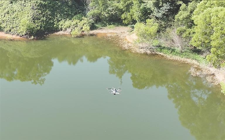 龍華排水公司在大水坑水庫用無人機進行水庫安全巡查。