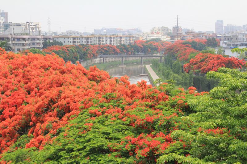 由于觀瀾河部分河道段兩側(cè)缺乏景觀特色,本項(xiàng)目主要針對(duì)龍華區(qū)全長(zhǎng)14.6公里的觀瀾河兩岸植物景觀進(jìn)行提升,通過(guò)在河岸兩側(cè)有條件種植的區(qū)域,適當(dāng)增加鳳凰木和大腹木棉,將斷斷續(xù)續(xù)的鳳凰木點(diǎn)植形成帶狀景觀,打造成壯觀的觀瀾河“紅飄帶”景觀。