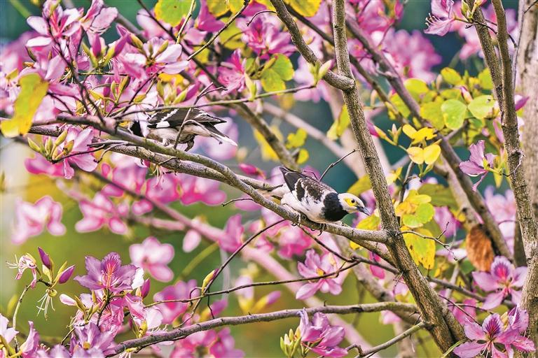 北站中心公園內(nèi)宮粉紫荊競(jìng)相盛放。