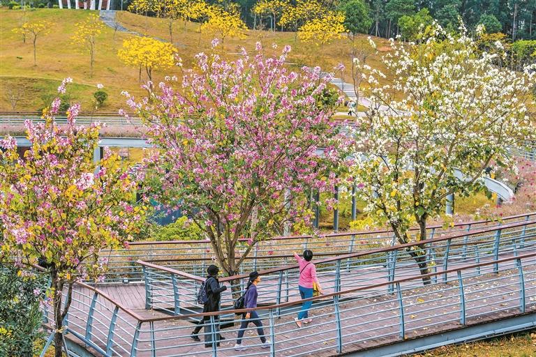 市民一邊漫步于公園棧道,一邊欣賞盛放的花兒。