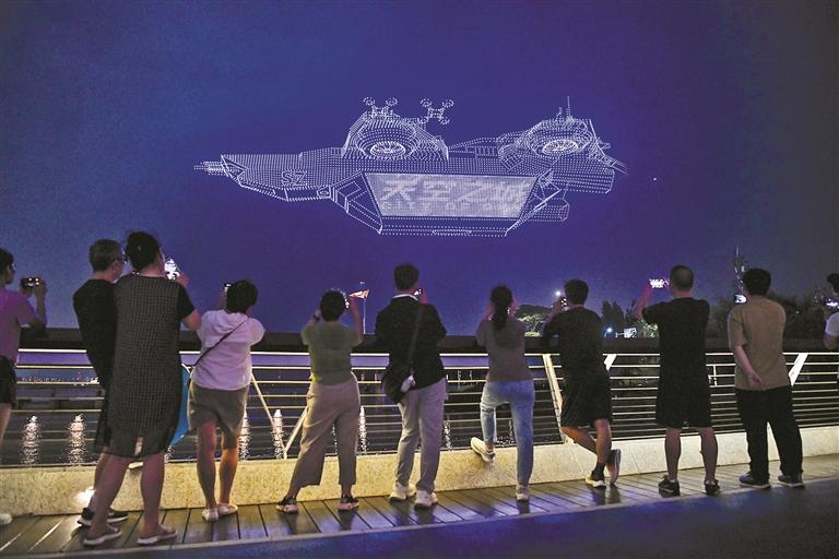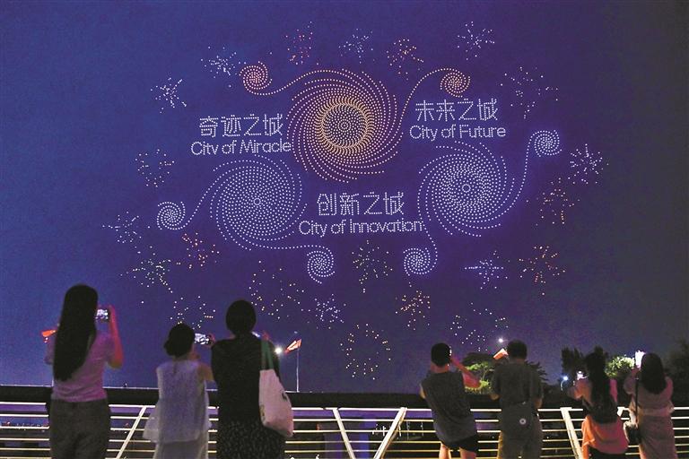 市民、游客在深圳灣觀看大漠大智控呈現的無人機編隊表演。