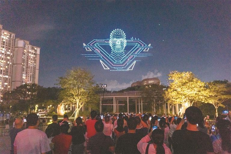 深圳北站中心公園內,早早聚集了前來觀看無人機表演的市民群眾,當無人機緩緩升起并在天空上幻化出各種圖案時,市民驚嘆聲不斷,并用手機記錄下難忘的一瞬。