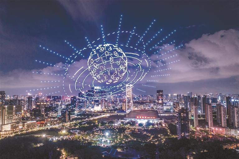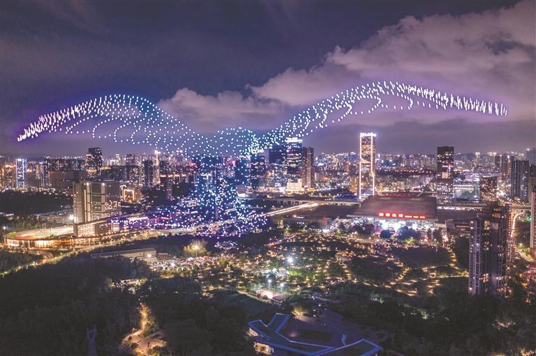 當晚,無人機方陣以“生命之源”“金色傳說”“生意盎然”“奮斗未來”“星河璀璨”五個篇章共11幕畫面生動展示了藝術與科技之美。