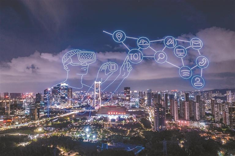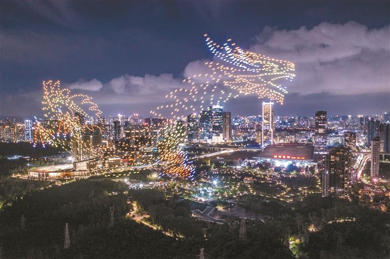 據悉,依托龍華本土企業大漠大智控的無人機天空數字新媒體展演技術,無人機天空數字新媒體演出結合傳統節日以及龍華區重大活動等在深圳北站中心公園常態化演出,以“無人機+場景”的應用將眾多藝術符號“搬”上浩瀚天空進行演繹,成為點亮城市新景觀和旅游夜經濟的重頭戲。
