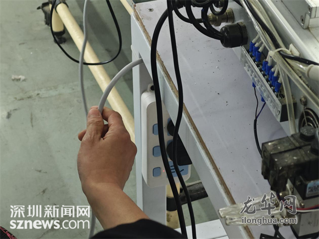 執法人員來到操作臺前測試電線路,發現該插座缺少地線,提醒插座缺少地線,容易導致企業員工作業時發生觸電事故,并要求安全負責人及時整改。