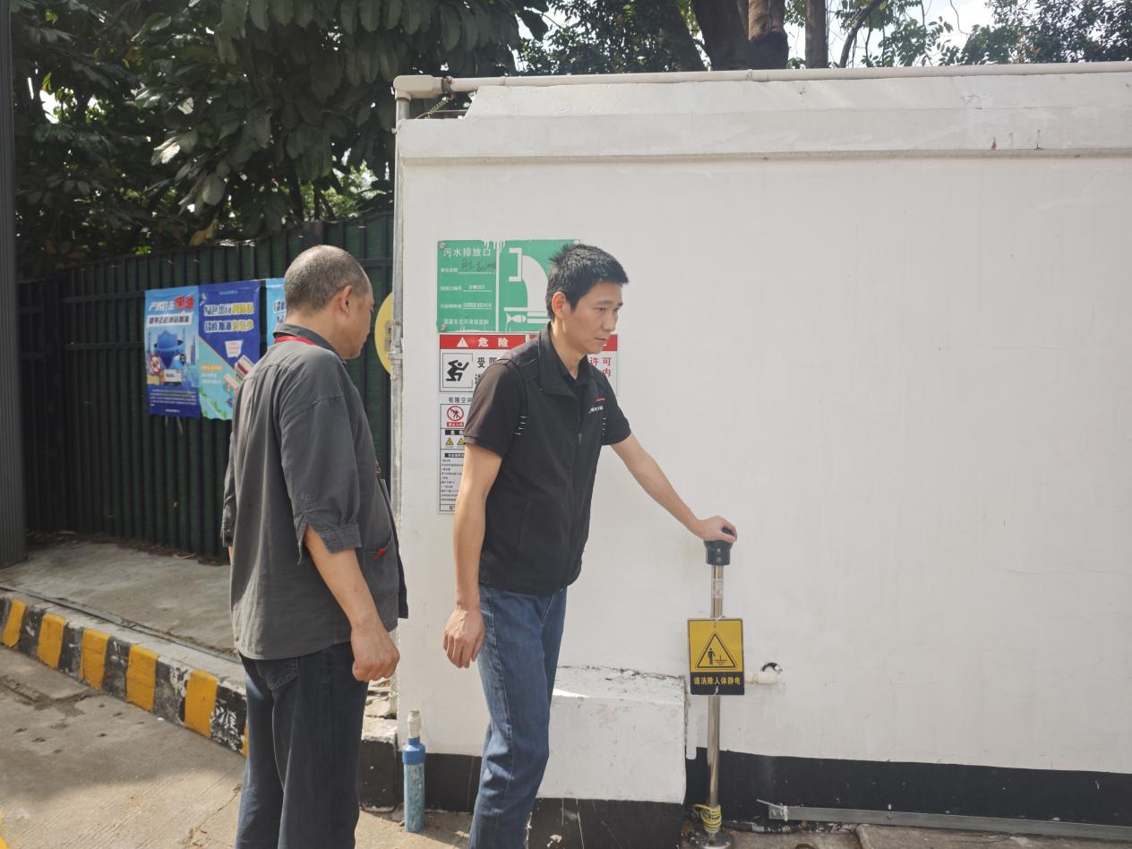 執法人員一行來到卸油作業區(儲油區)檢查。進入該區域前依次長按圓球,釋放身體靜電。“卸油作業區會有少量的揮發性油氣,存在較大火災風險,這個裝置能夠有效的將身體的靜電導入到地下,避免靜電釋放等點火源。”執法人員解釋道。