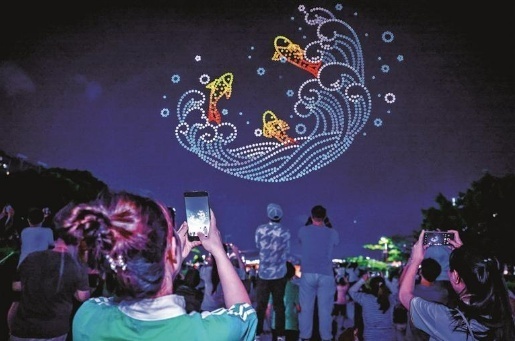 無人機演繹觀瀾河(三條小魚跳躍)主題表演。